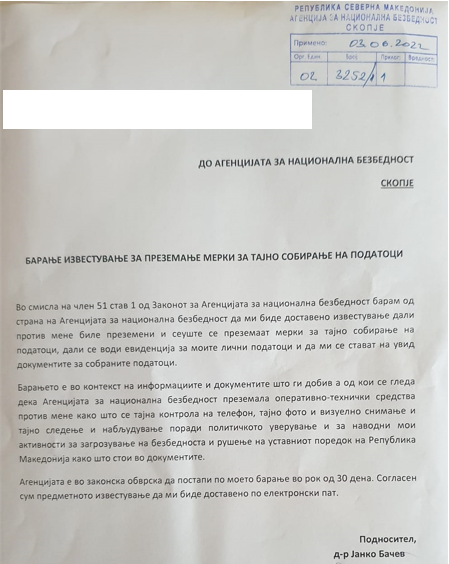 Денес го искористив законското право од Законот за Агенцијата за национална безбедност и поднесов барање во смисла на член 51 од законот кој дава можност секое лице да се обрати до АНБ и да побара известување дали против него се собирани тајни податоци. Согласно Законот, АНБ сега има рок од 30 дена да одговори на барањето.
